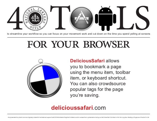 - DeliciousSafari is a plug-in for the Safari web browser to provide access to del.icio.us bookmarks directly from the browser. Lists Featuring This Company. San Francisco Software Companies. 3,952 Number of Organizations. $66B Total Funding Amount. 11,854 Number of Investors.
